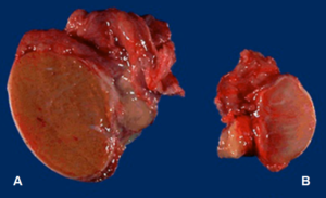 Fig 1 – Desproporção entre o testículo normal (A) e o criptorquídico (B).
