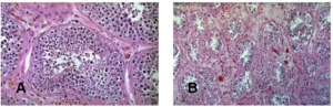 Fig 2 – Microscopia ótica de testículo. Coloração por H&E e aumento de 40X. (A)
