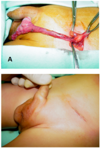 O tratamento cirúrgico (orquidopexia), previne a degeneração do testículo causado pela alta temperatura já que a temperatura no escroto é 30C a 40C menor do que a intra-abdominal. A via inguinal ou, até mesmo a via laparoscópica, têm sido empregadas para realização das orquidopexias. O tratamento consiste na colocação e fixação do testículo distópico no interior da bolsa testicular. Vasos curtos são por vezes, fatores limitantes impedindo, mesmo após dissecção exaustiva, que o testículo alcance a bolsa (Fig.6)